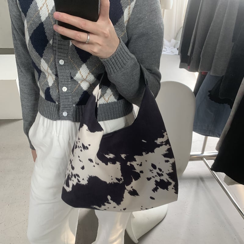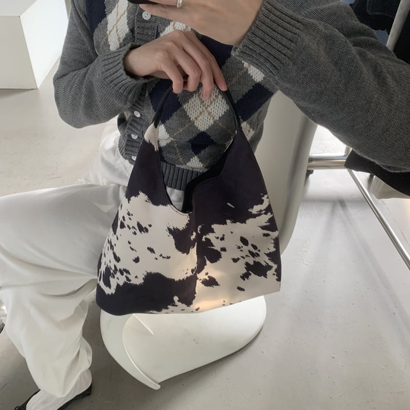 カウ柄が目を引くワンハンドルバッグです。