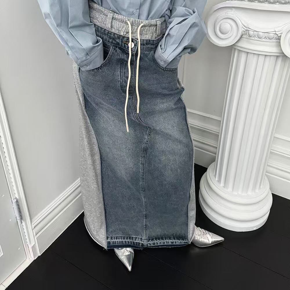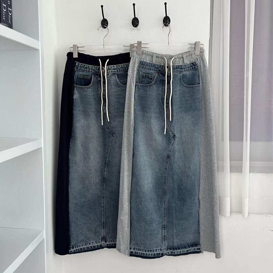 スウェットとデニムの切替デザインが目を惹くスカート。