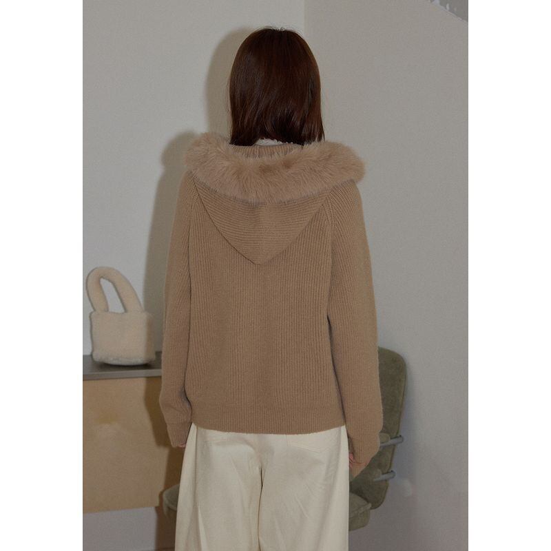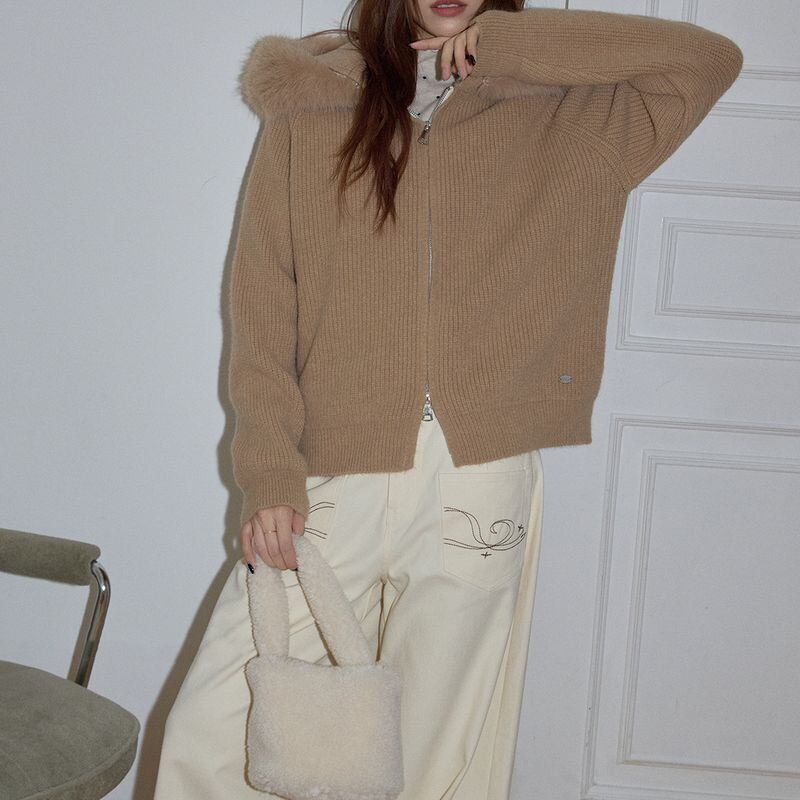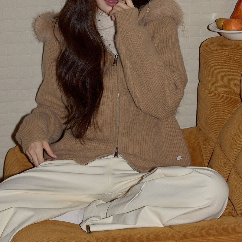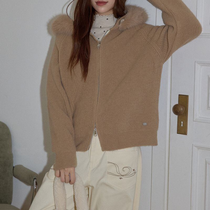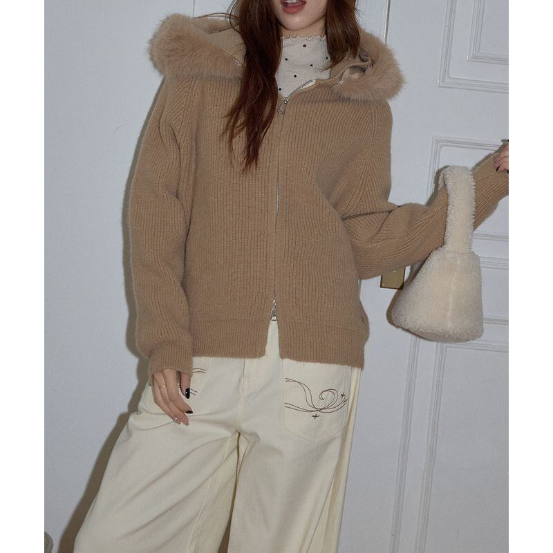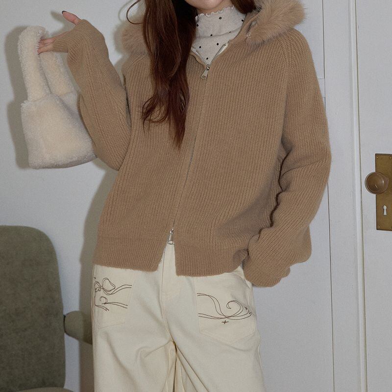 ファー付きフードが印象的なジップアップニットトップス。