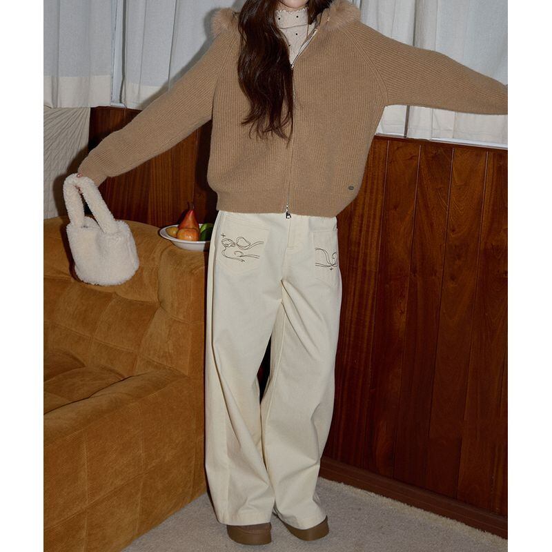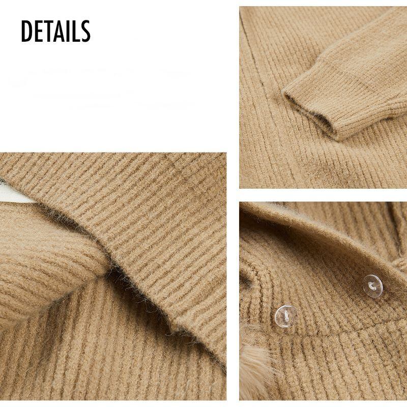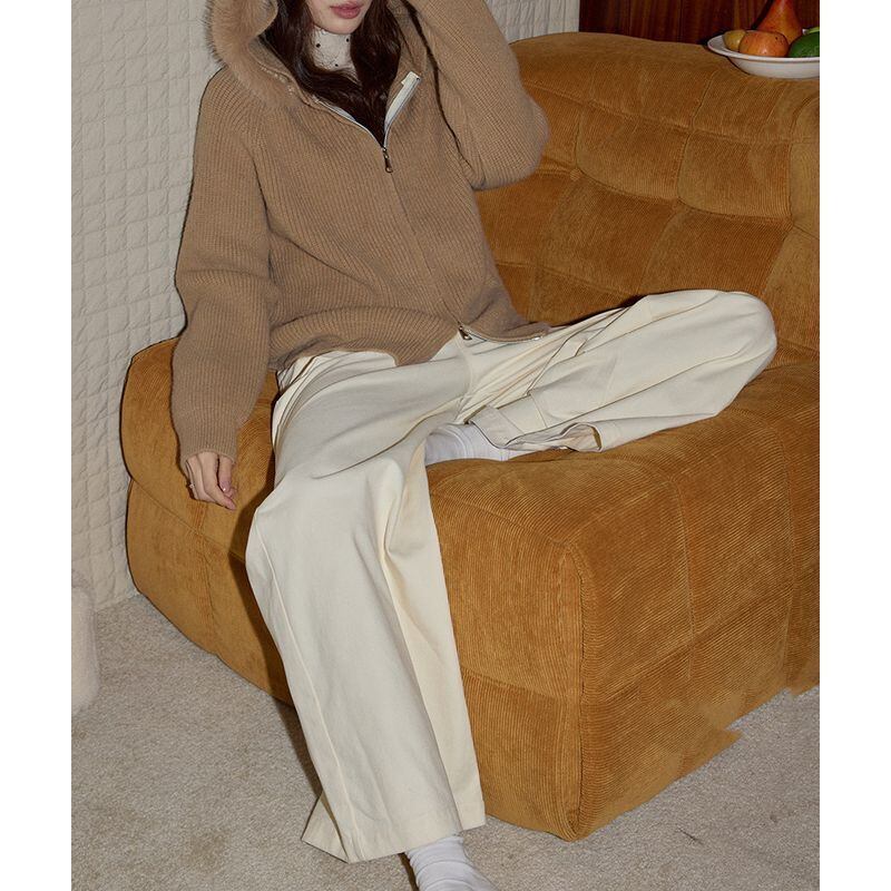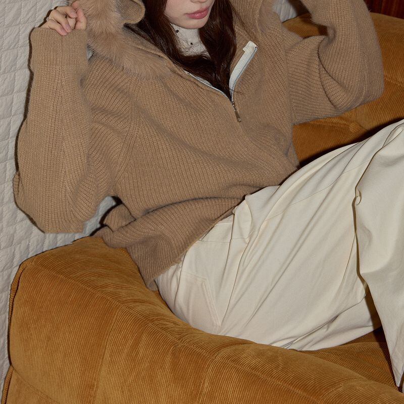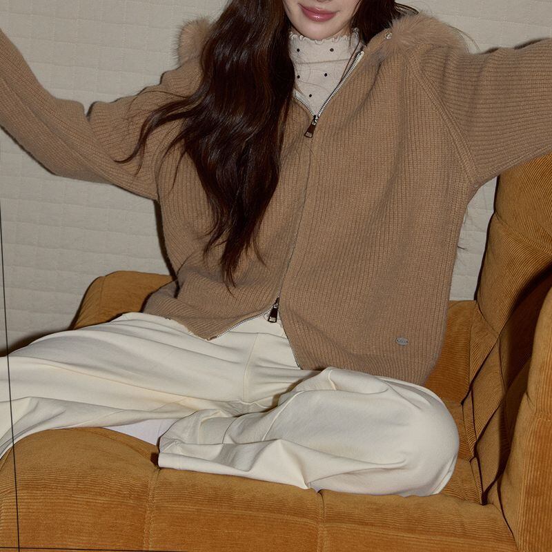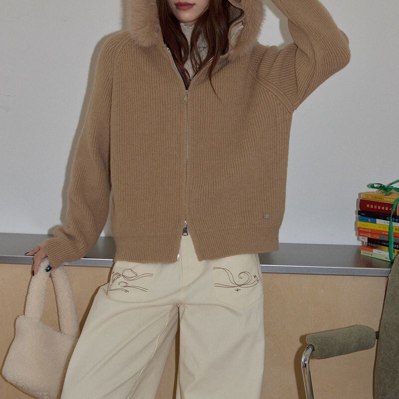 ファー付きフードが印象的なジップアップニットトップス。