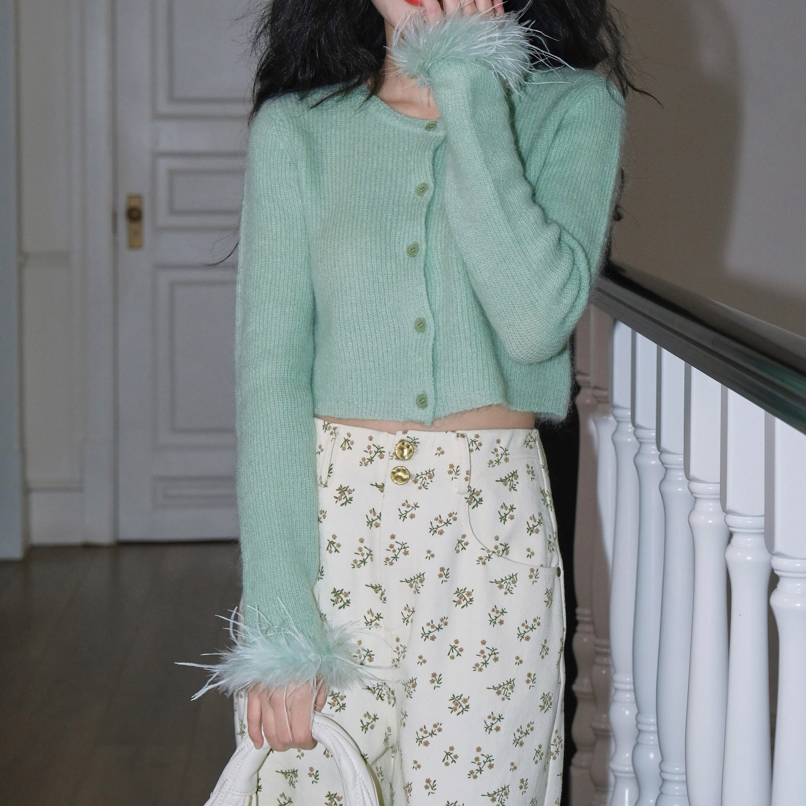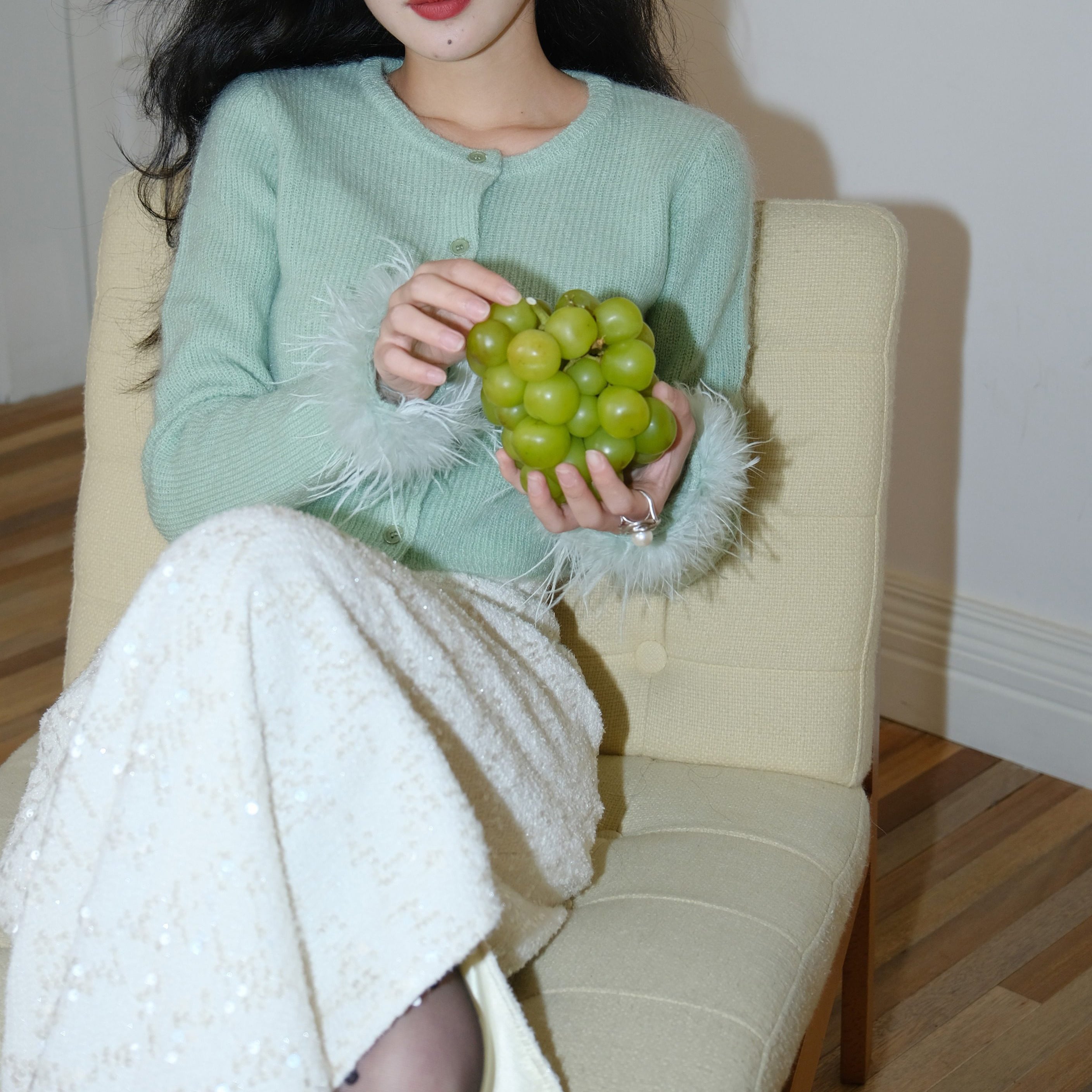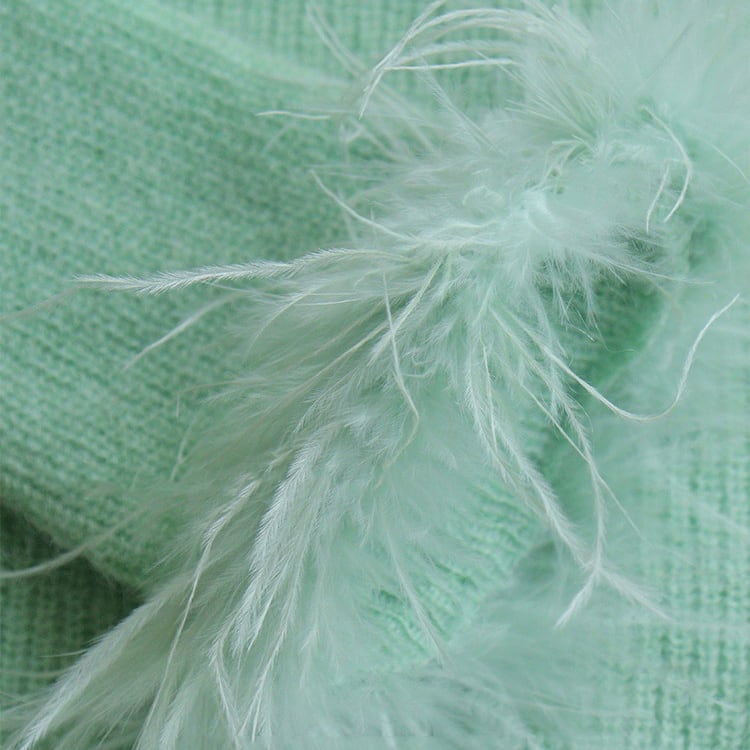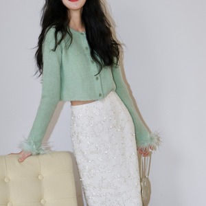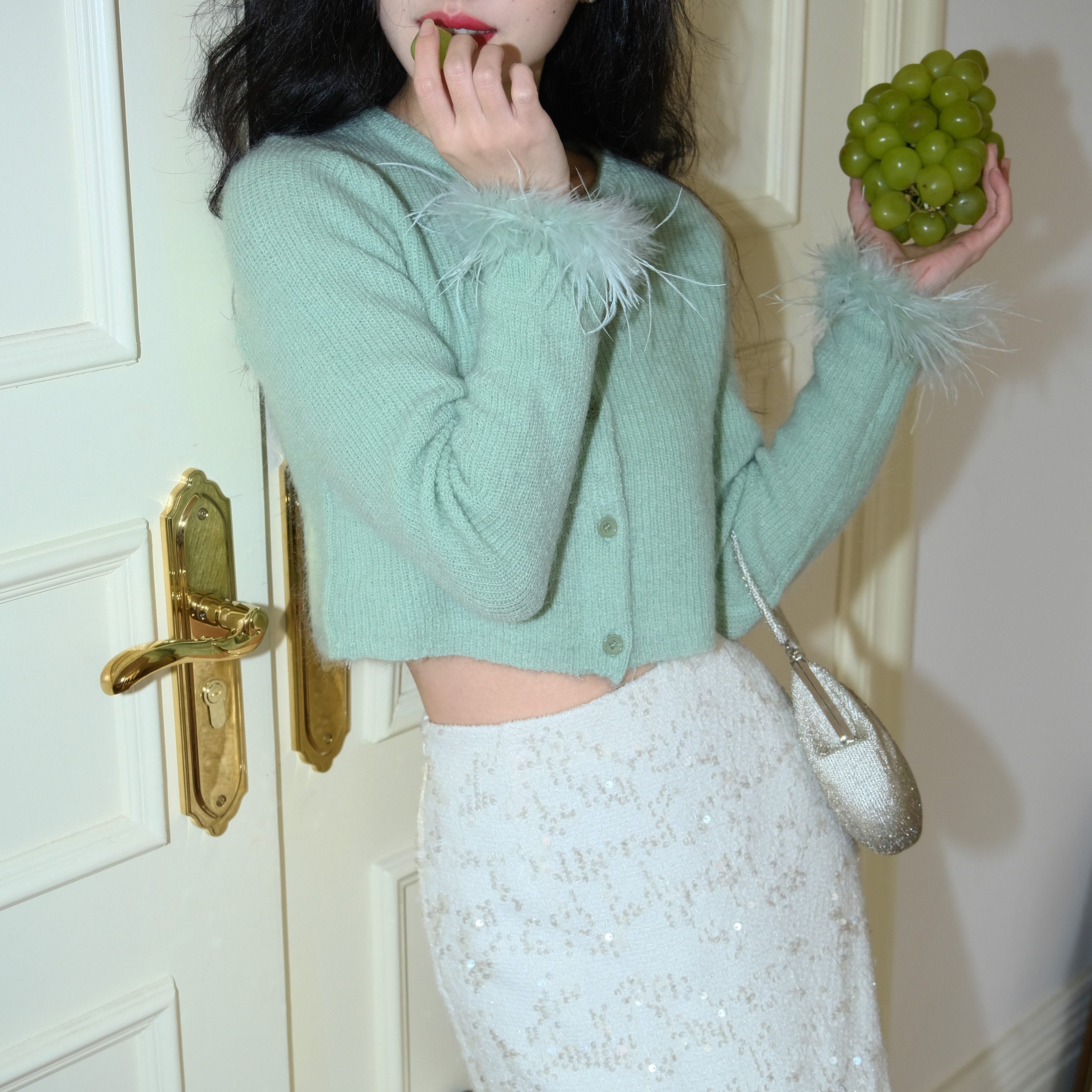 袖口のフェザーが華やかで、シンプルなコーデに合わせるだけで主役になれるデザインです◎