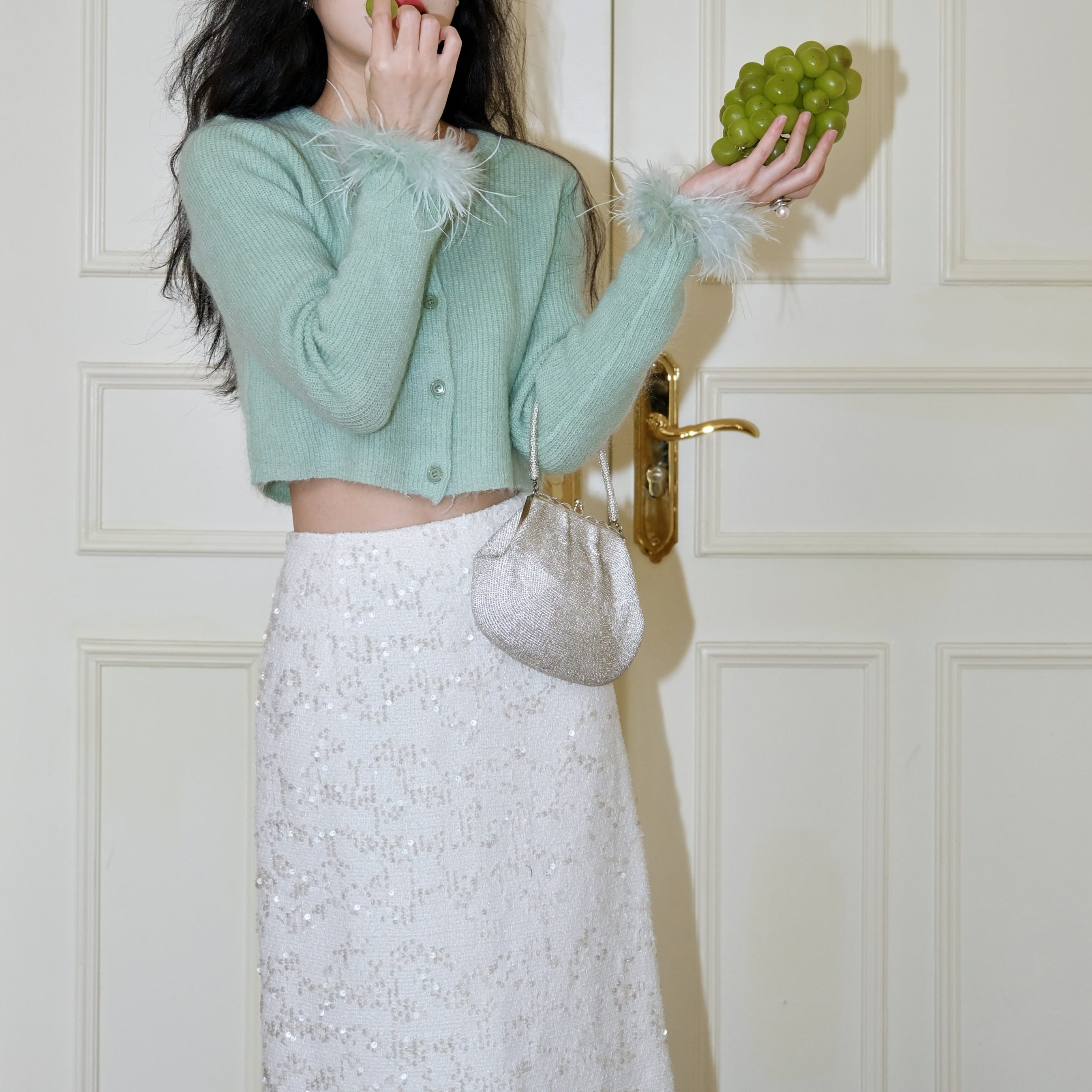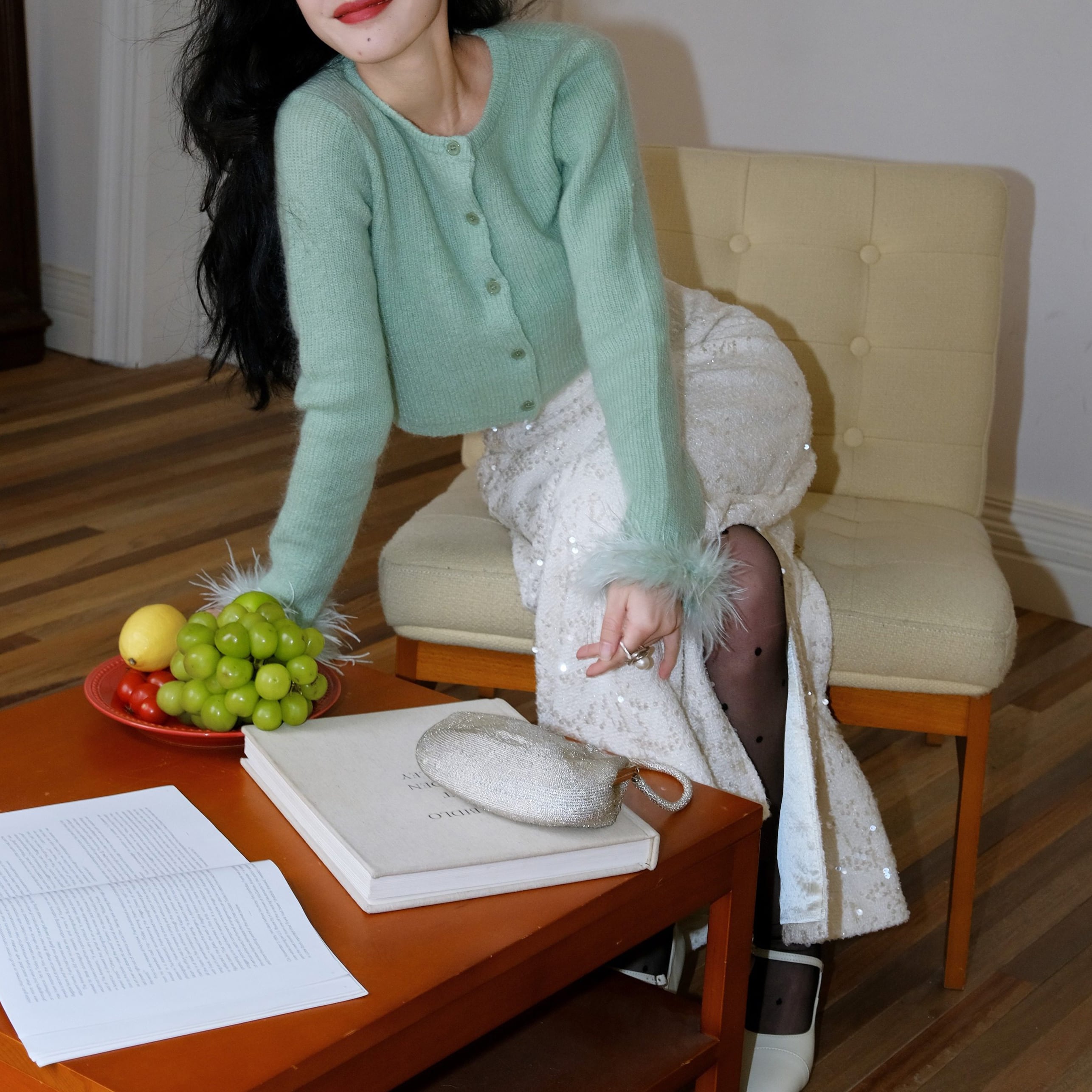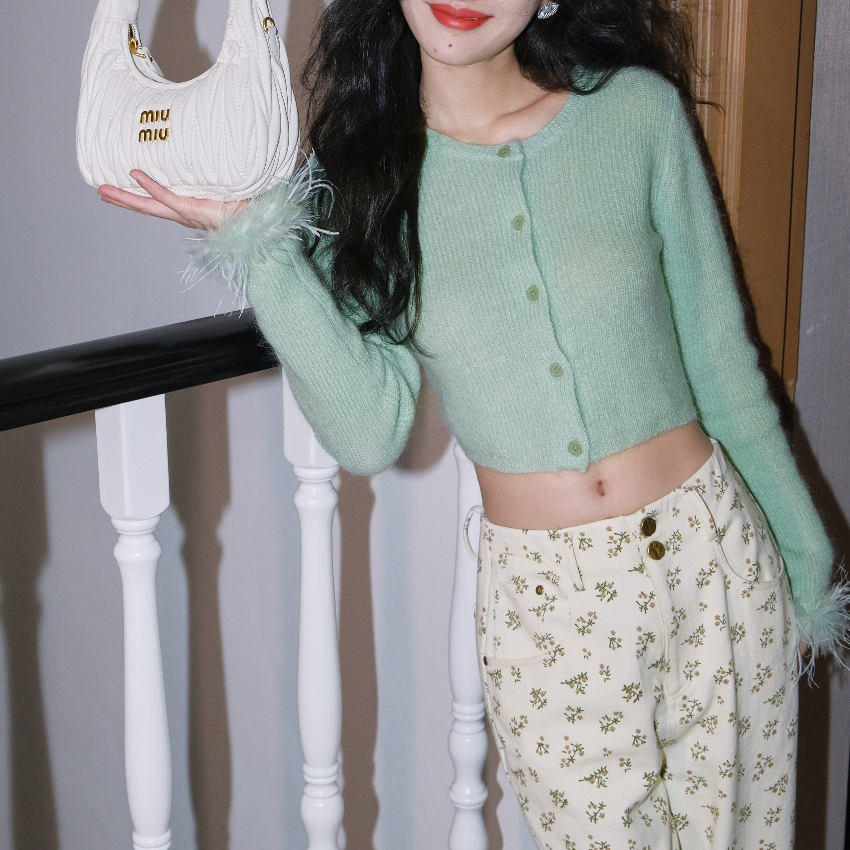 袖口のフェザーが華やかで、シンプルなコーデに合わせるだけで主役になれるデザインです◎