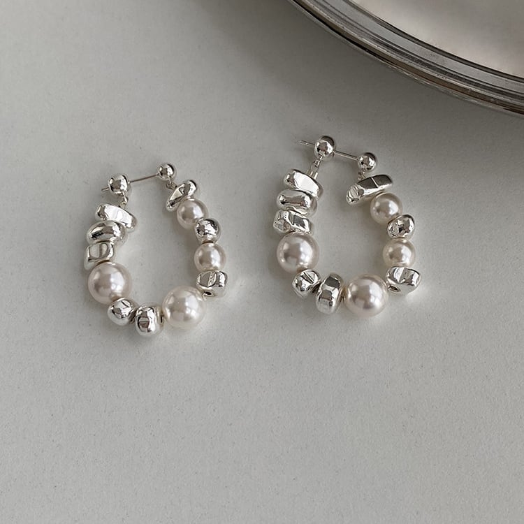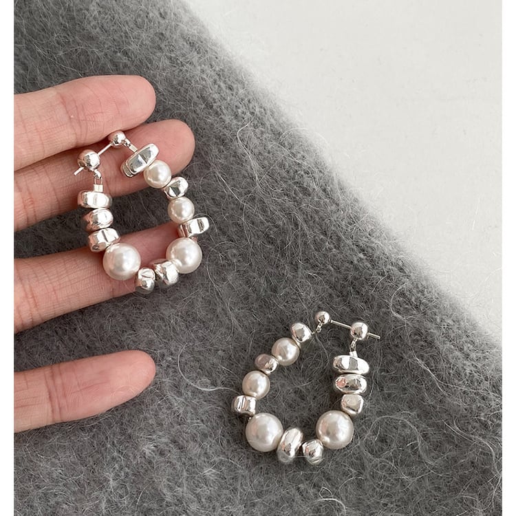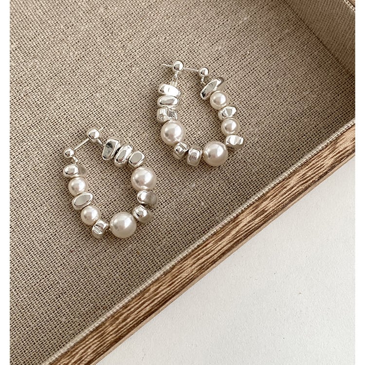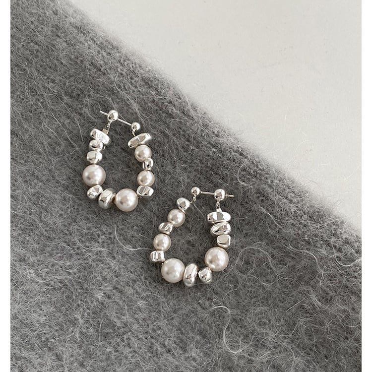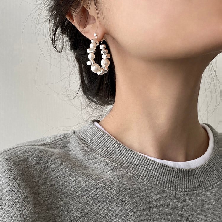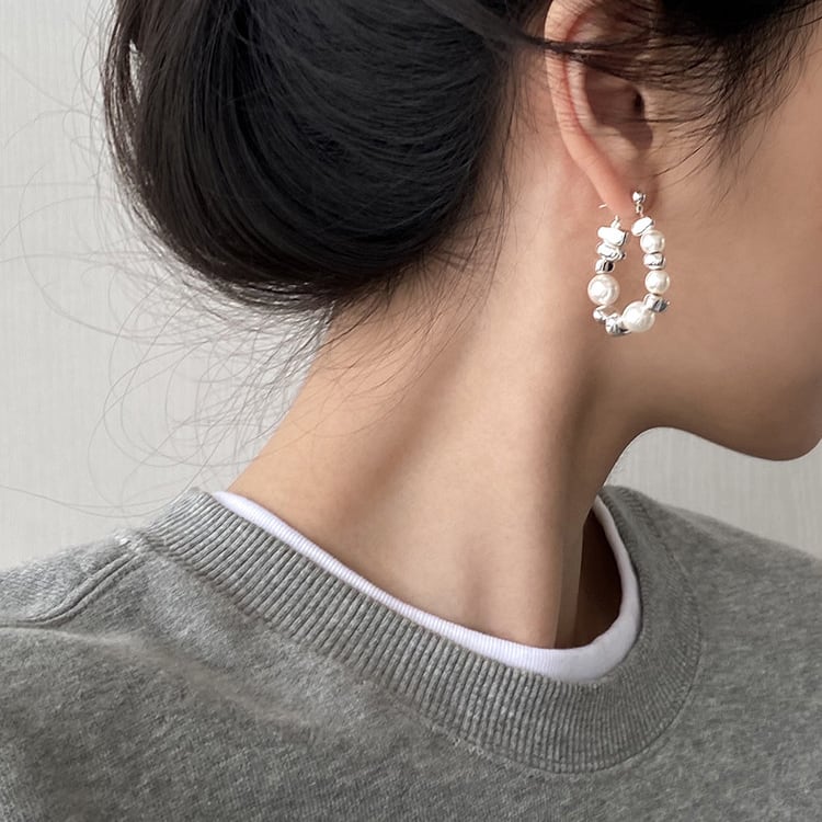 パールとビーズのランダムな組み合わせが、洗練された印象を与えるドロップピアスです。