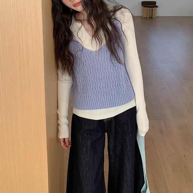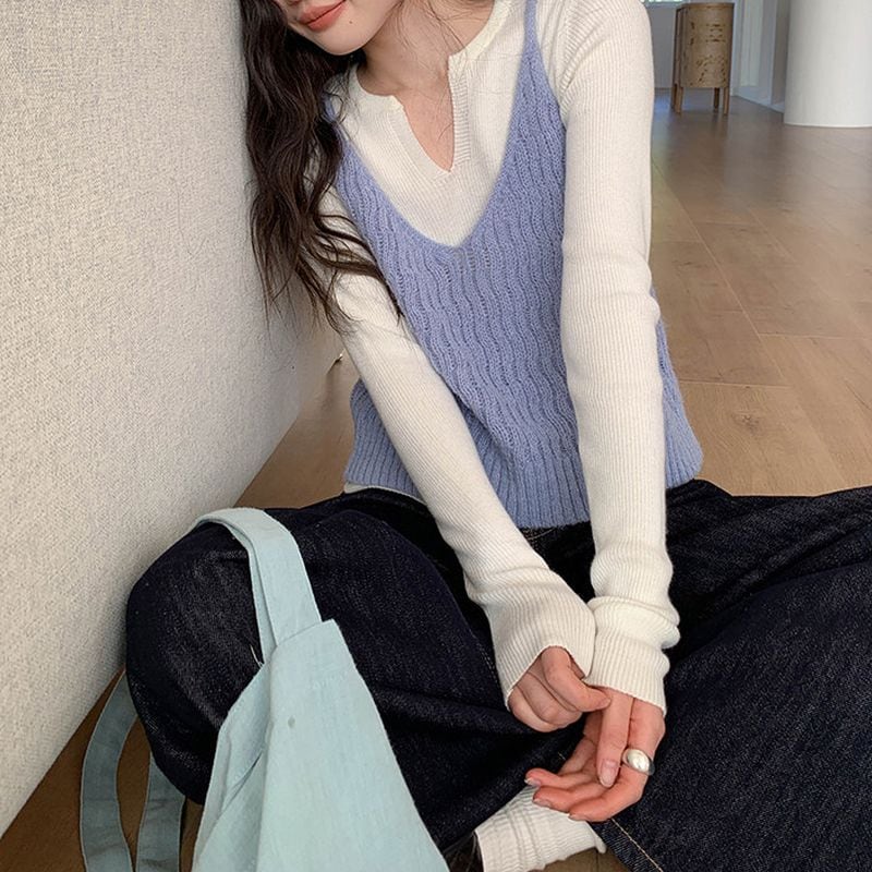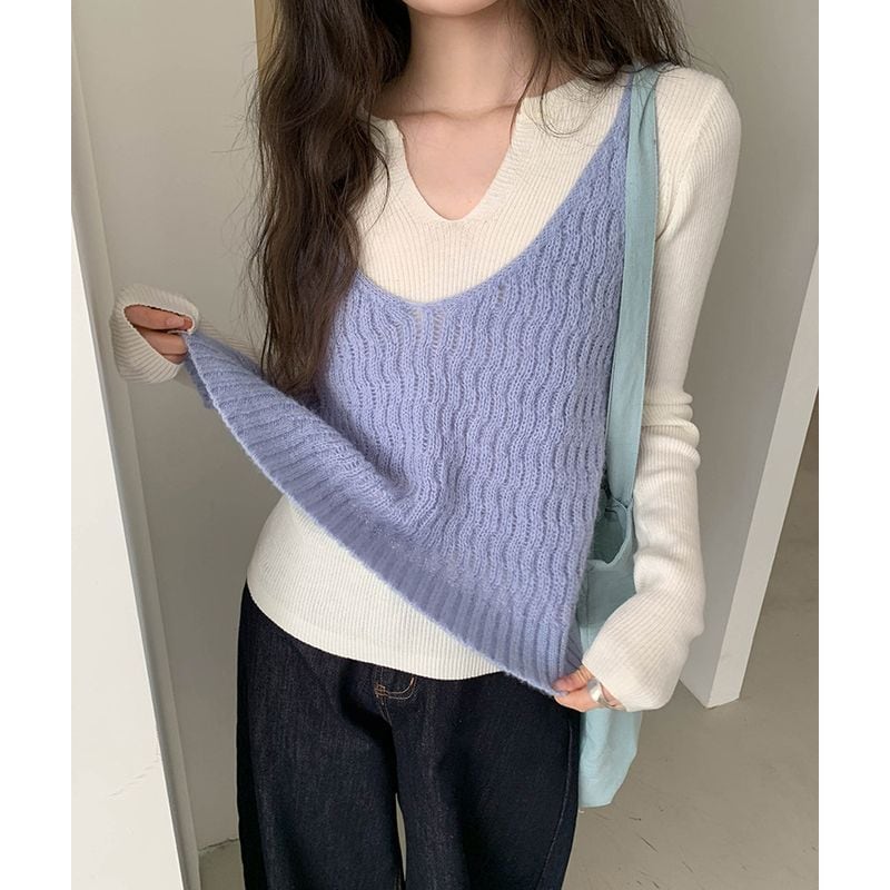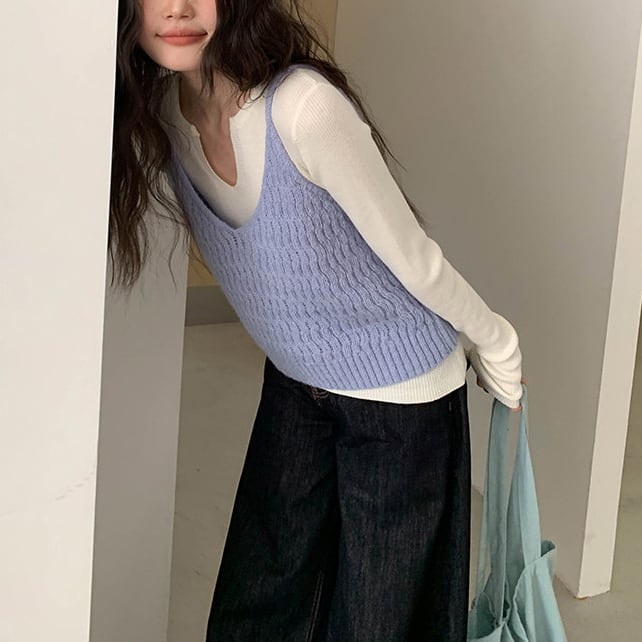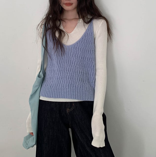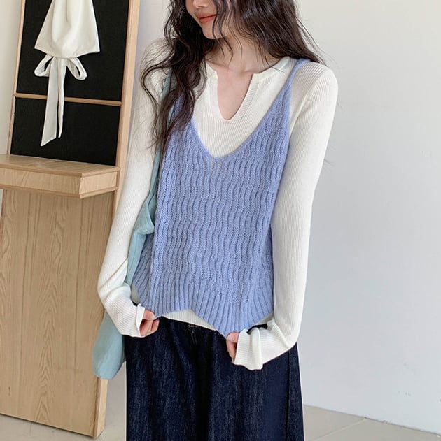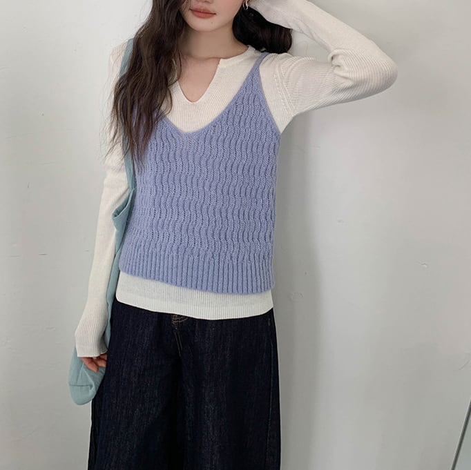 いつものトップスに重ねるだけで、トレンド感あふれるレイヤードスタイルが完成。深めのVネックが、顔周りをすっきりと見せてくれます。ミディアム丈なので、どんなボトムスとも相性抜群。