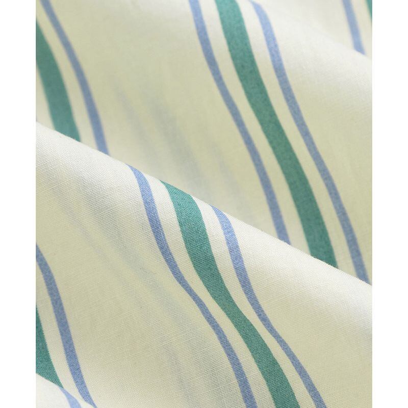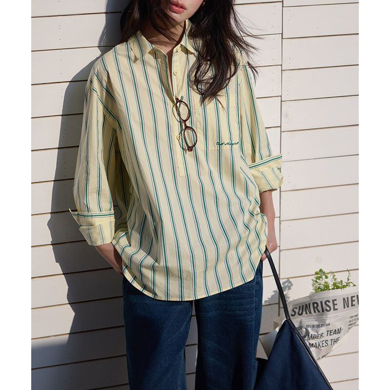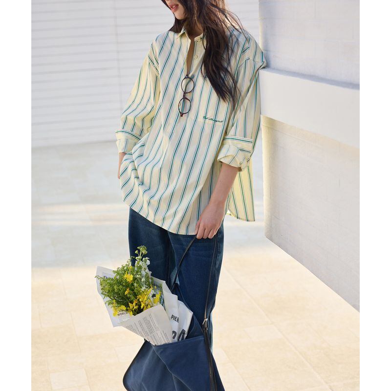 爽やかなストライプ柄が目を引く、オープンカラーの長袖シャツ。
