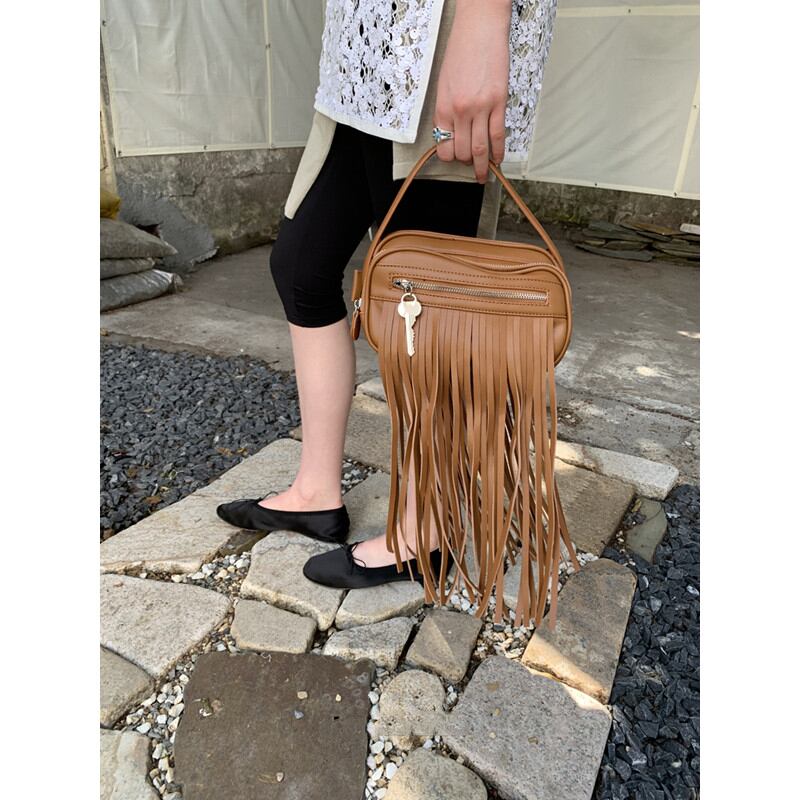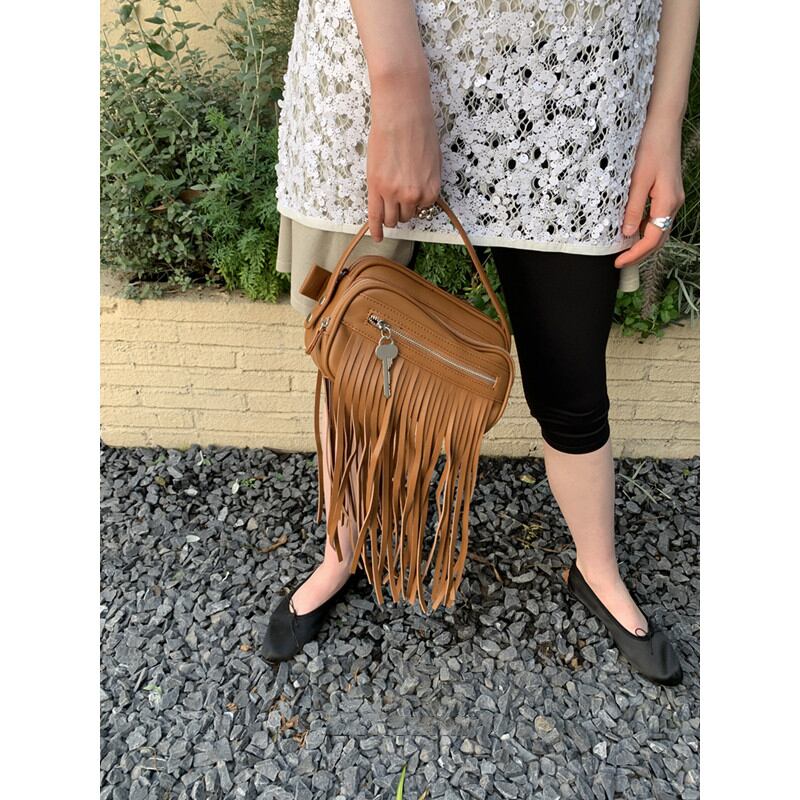 コーディネートのアクセントになる、フリンジデザインが目を引くショルダーバッグ。