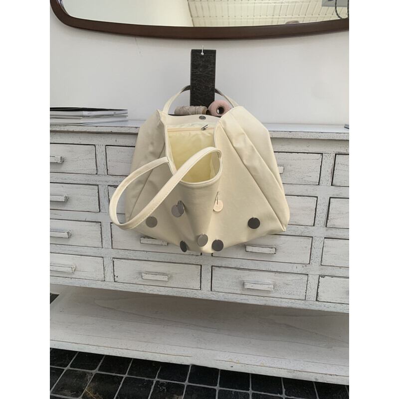 ドットが目を引く、普段使いにぴったりのトートバッグ。A4ファイルや書類も収納可能で、通勤や通学にも便利です。シンプルなコーディネートのアクセントにもなるデザインです。